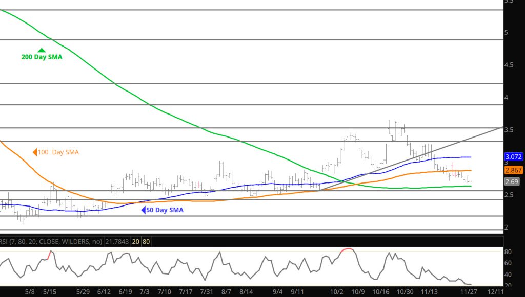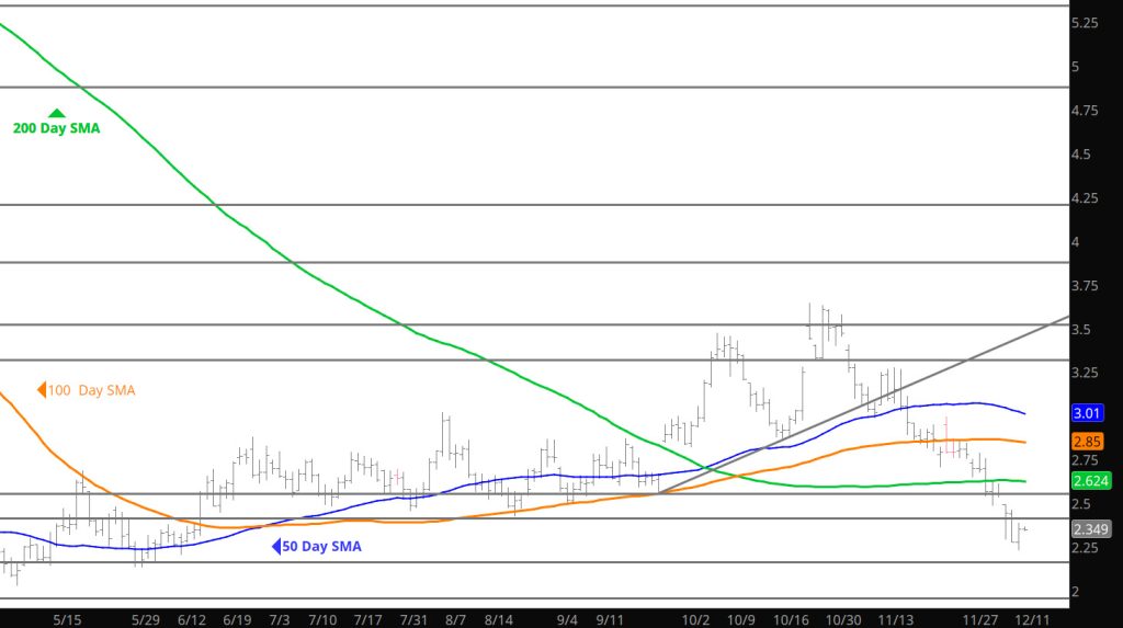 Last week in the Daily editions I mentioned several times about the potential of a short covering. Unfortunately, that did not happen at least not yet. Rather than a short covering rally failure to overcome the declining resistance triggered a high volume extension of the down trend through the November low ($2.669) for the seventh straight year (and 9 of the last 10 the November low has been violated during December) and support expected to be presented by the 200 – day SMA but did not happen. With still higher volume the highest volume day since the October high (678, 722 v 682,359 contracts, and before that the August high 805,853) January plunged to begin a test of substantial conventional support presented by the July/August/September lows, $2.463, $2.425, and $2.500, respectively. Check the Weekly chart below: