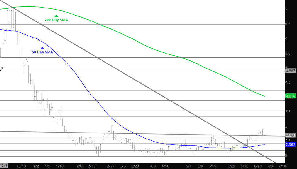 An average decline from the June high suggests a target of $2.40 – $2.50 which also just happens to be the value of a violated declining trend line drawn from the March and highs (currently $2.467 and falling about .03/wk). This was the key break out area discussed a few weeks ago.