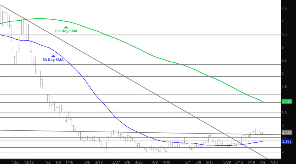 It was good to see the August contract come back to the July expiration — so we don’t have to discuss that convergence. Now we get a storage number on the heels of a fairly aggressive fundamental demand week according to some of my fundamental traders. Still range trading between $2.47 and $2.80 — so pick your side.