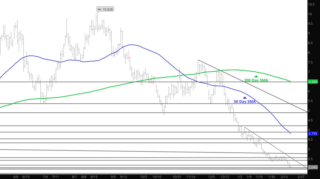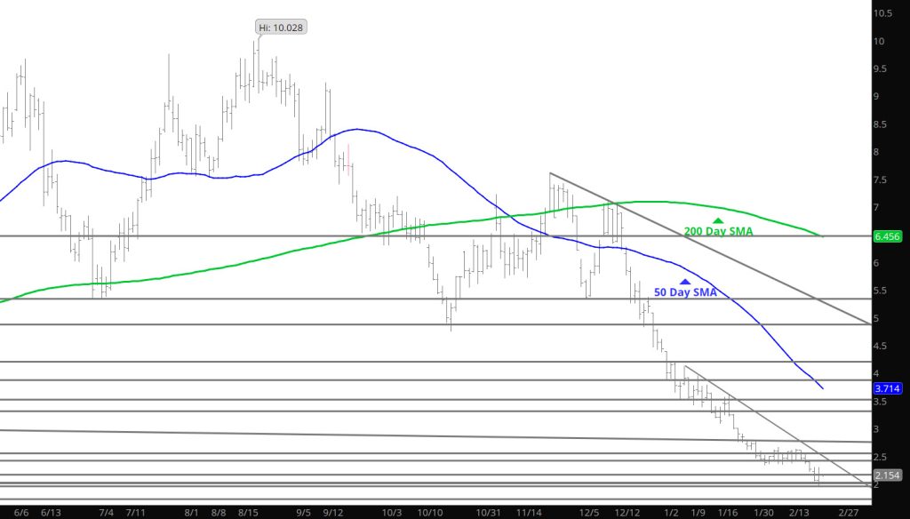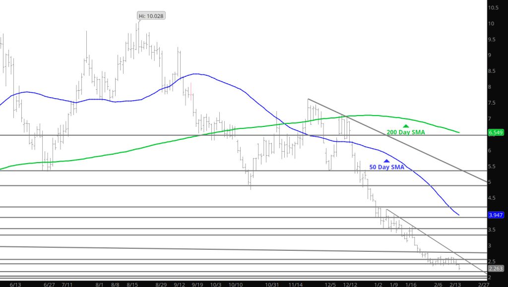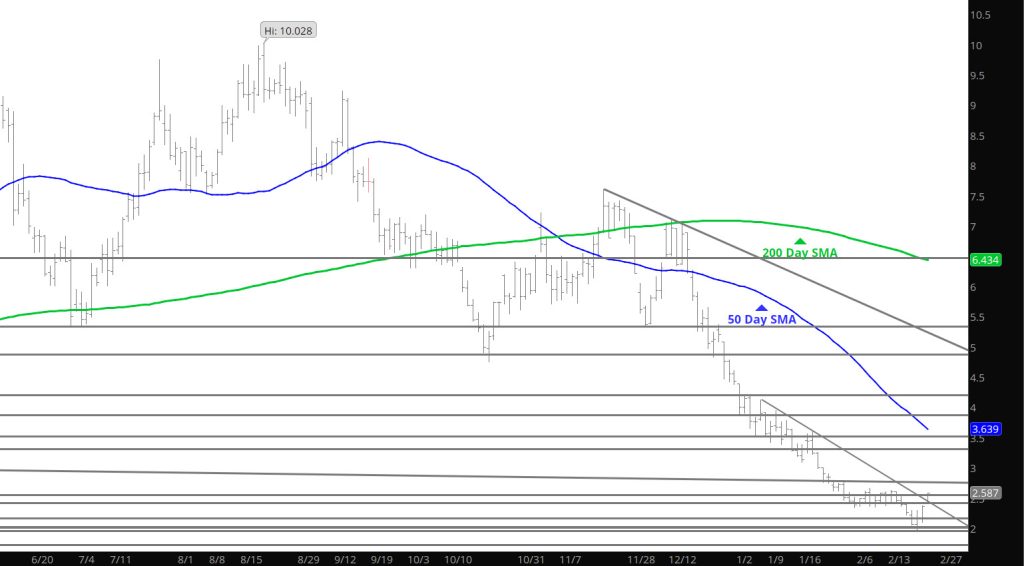 The second step of the bias change will come with a solid test of support and prices rebounding from the test. Yesterday just provided additional gains with volume expansion into the $2.70’s. Recent runs have provided technical damage to the bear bias of the last few months — but the medium term bias has not be defined — yet.