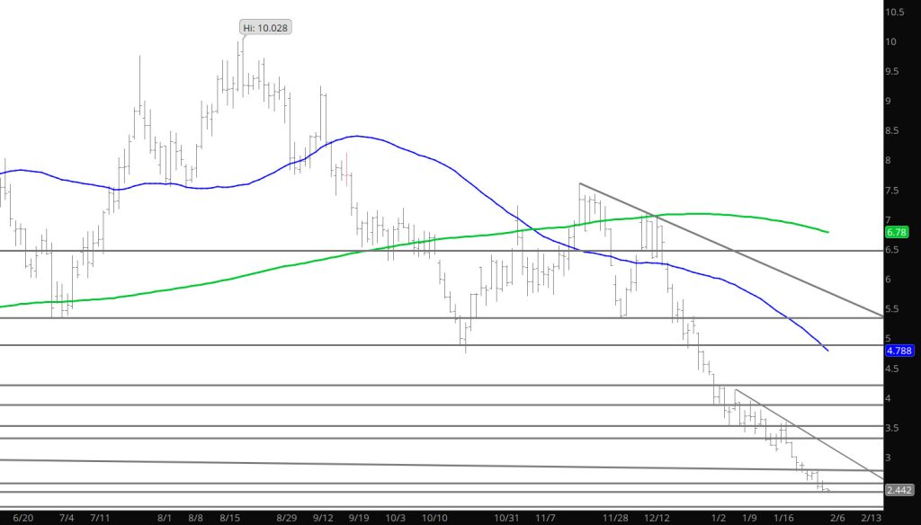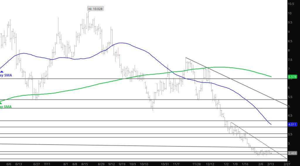 My apologies for no Daily yesterday — illness limited my computer time. The trade on Monday and yesterday (more so yesterday) did take on some of the characteristics of short covering— but will have to wait until open interest and volume are final. Explaining “some” is about the volume with the open interest at key levels of resistance and/or support– which yesterday broke through the $2.50 area finally (resistance) and closed above that level. That does not suggest the market is off to the rallies — rather just an adjustment in the trader’s eyes. We will know when the short covering rally has commenced when there is a strong volume day and open interest declines.