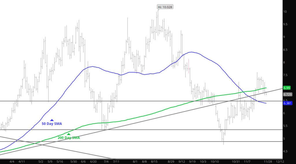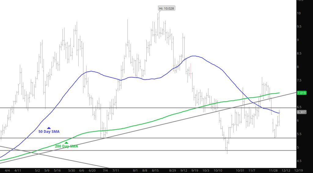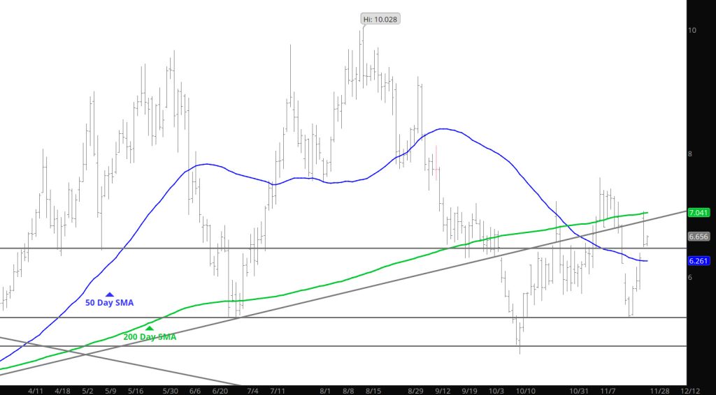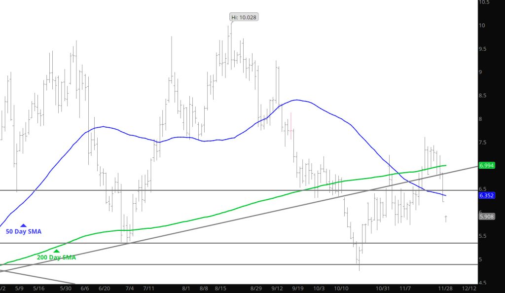 Did not see that rally coming off of a bearish storage report–once again when folks expect a bearish report and set themselves up for a negative report and they get it — there is no follow through. It happened a couple of times last month when expectations were met(bearish report) but the market had already sold the news– Prices went up after the release. Can’t say that was the result yesterday– but the move up took out some stops and left me curious of what this market is saying. The gap did not close but got with in a few pennies before retreating– the gap would be the place to initiate positions but prudence has this trader waiting until clearer intentions become prevalent.