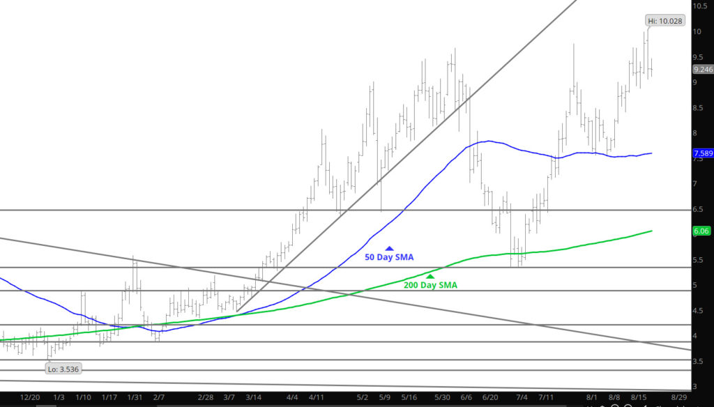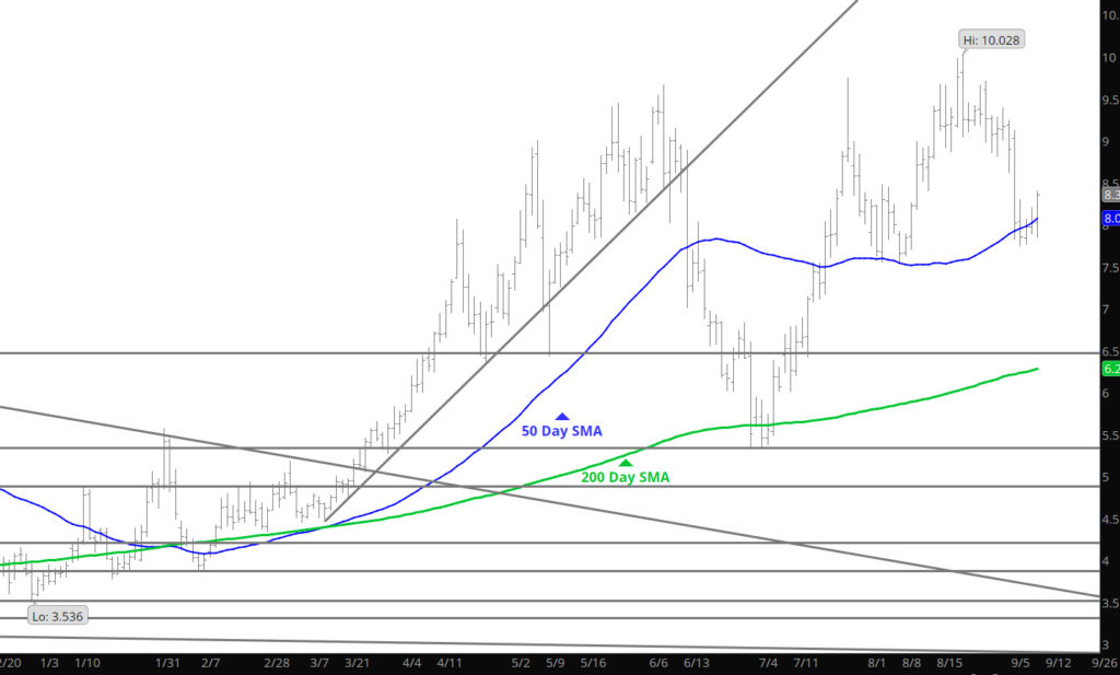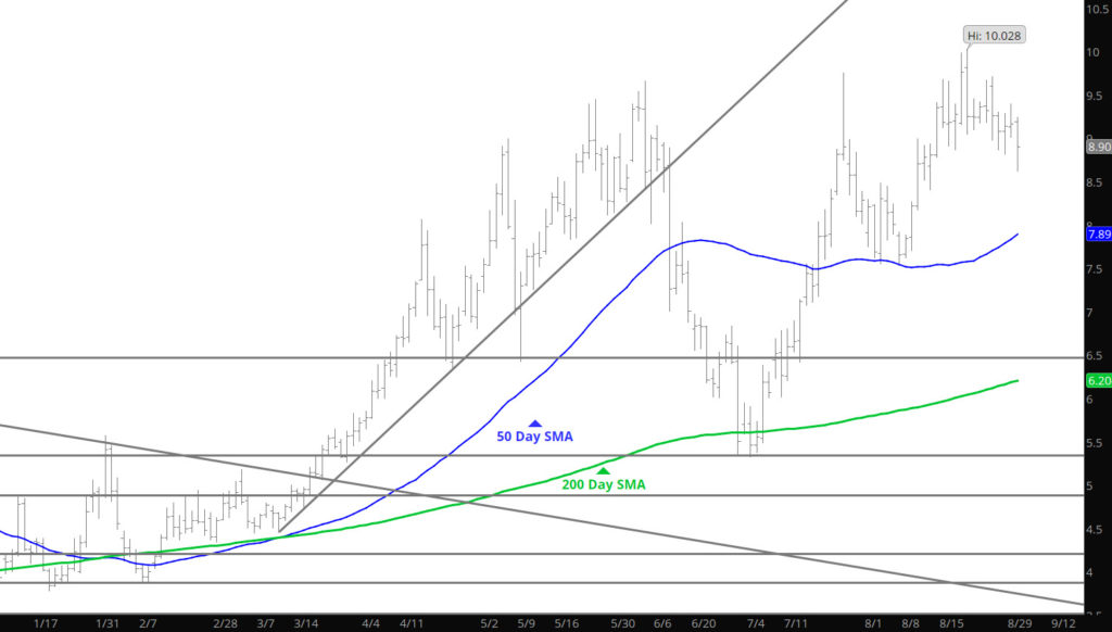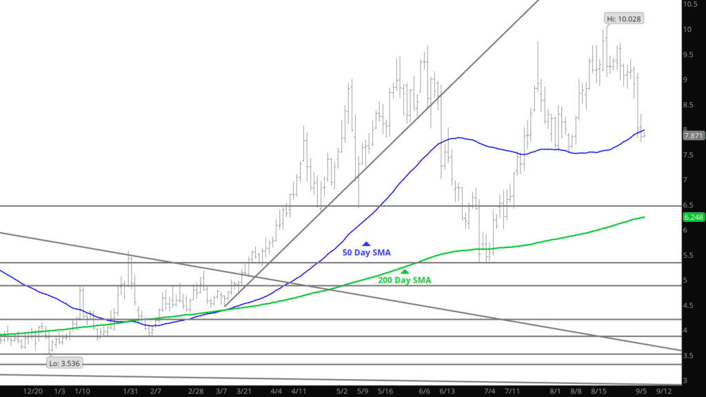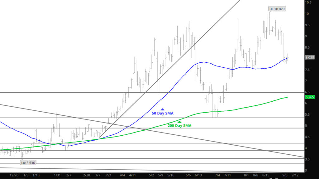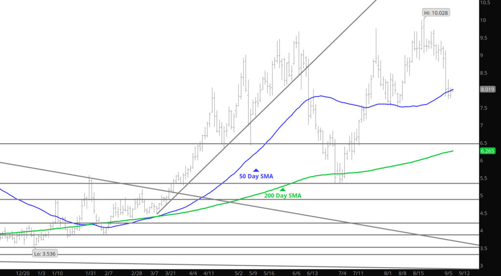 Prices continued the extension of the declines, as prompt dipped below $8.00 briefly, challenging the 50 day SMA and attacked the 20 Week SMA that have been well held support zones lately. The key will be how does the market respond on this test. If support holds then the range up to $9.00 remains, a break down below will suggest the lows of early August around $7.50 are in target.
