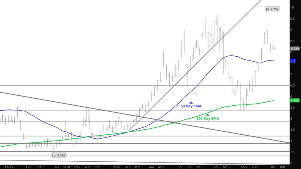 Very rarely do I utilize a moving average test as a serious test of support– but looking at the chart is very evident that buyers com in as prices test the 50 Day SMA since it broke out above last month. The range discussed now has to evaluate the high side as to where to profit, or hold for further gains.