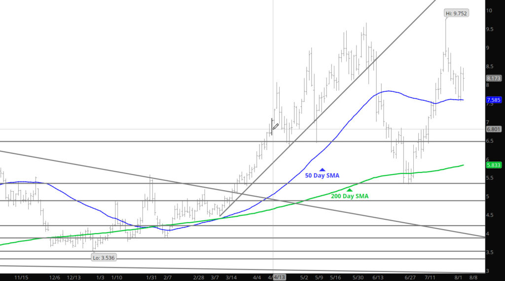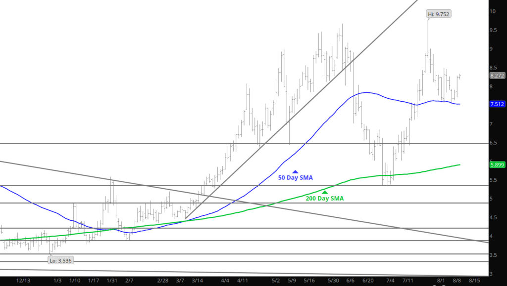Open interest and volume were both marginally higher for the week which is a technical negative for prices in the upcoming week. The decline from the June high to the July low was an intermediate term downtrend within the long – term uptrend. That said, the late July trade to a higher high that intermediate term downtrend has morphed into an exceptionally wide trading range. Rarely if ever has substantial support and resistance been so well defined…or so far apart.