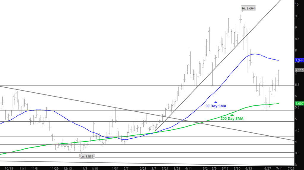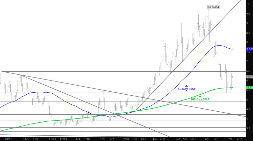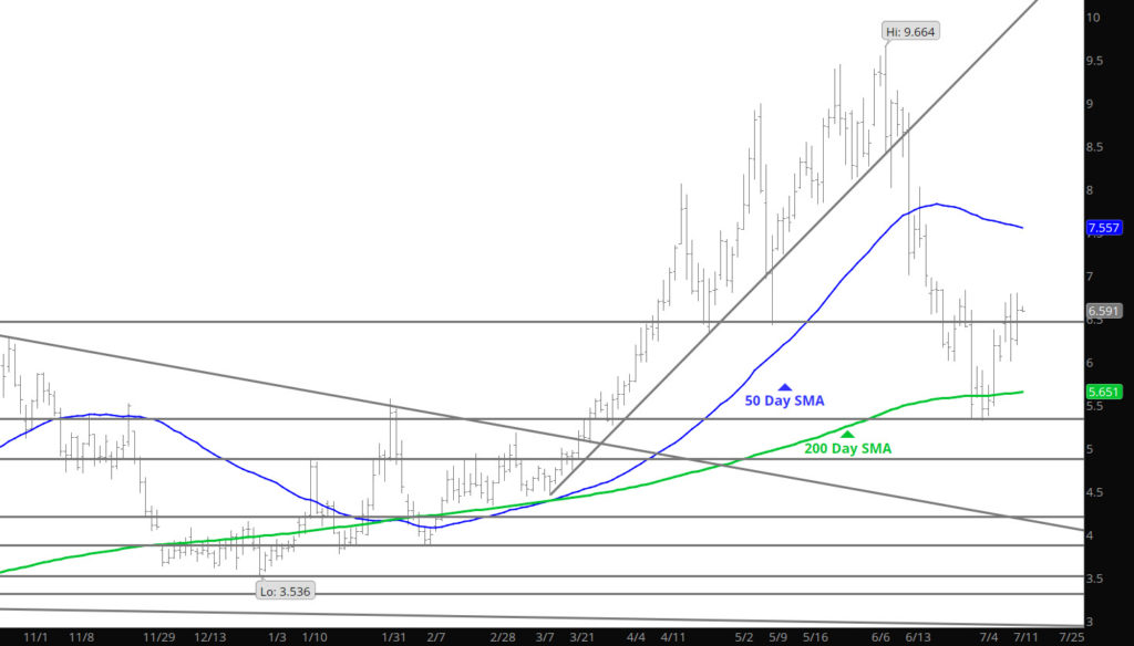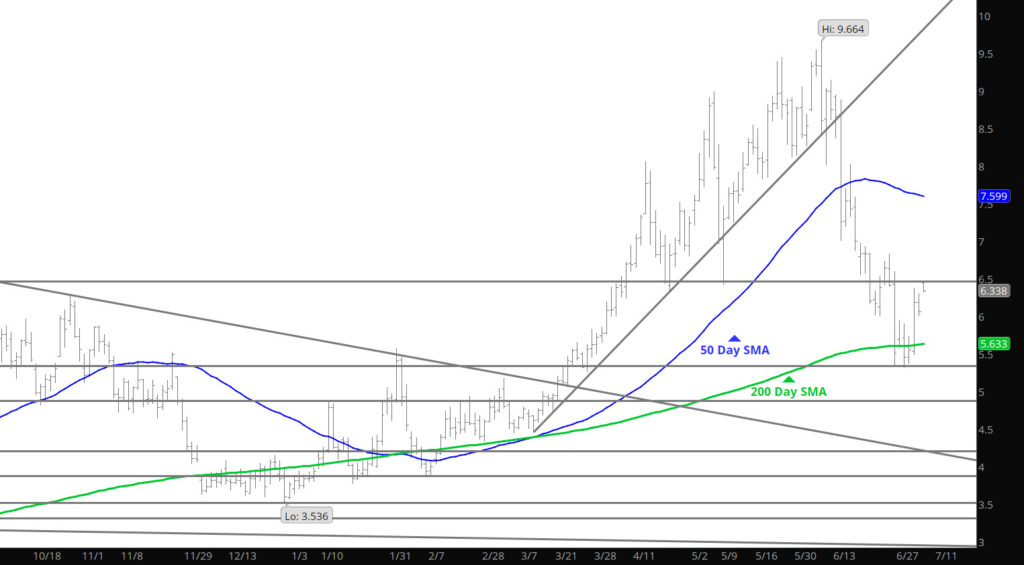 Prices did not rally quite as high as expected but the run failed (as expected) and immediately fell to test support at $6.00. That area has now held in the last three declines trying to break below. Accordingly, this price action should be respected as an area where buyers come in. As discussed previously, the market may be setting up a summer trading range (basically between $5.50 and $7.00) for prompt until the summer heat gets defined and the LNG plant issue becomes clearer. Until then play the market you are given.