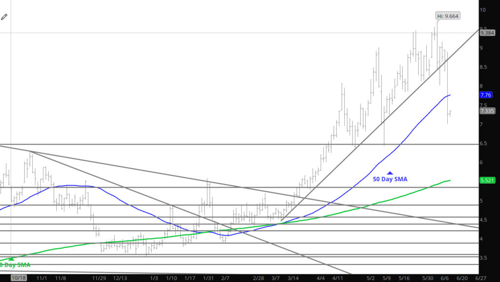No stranger to wild rides — July started down, blew back up to nearly $9.00 only to find a few folks interested in selling there. From there it was immediate collapse below the open and finishing down on the day. Been discussing the volatility in this market and it is not leaving me wanted. Yesterday close just on the trend line support that has been discussed here for a couple of months— does it break below which would suggest a test of the earlier lows just above $8.00 or preform another bounce and off to the races.