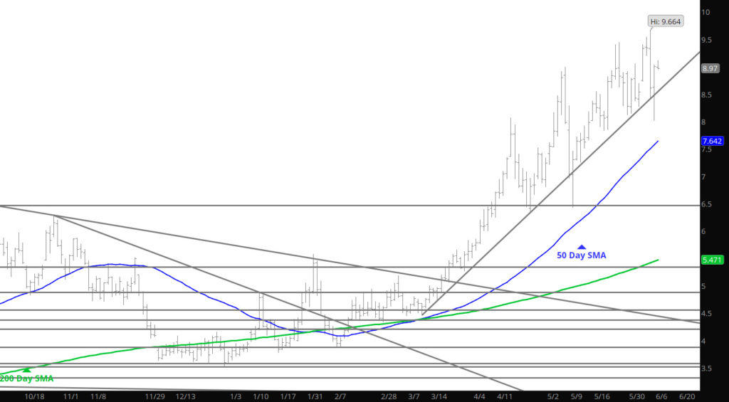Having issues with the internet while traveling — my apologies — Market down in Sunday night trade — not sure of any meaning. Continue to play to the ranges selling near $9.00 and buying dips especially into the low $8.60’s for now.