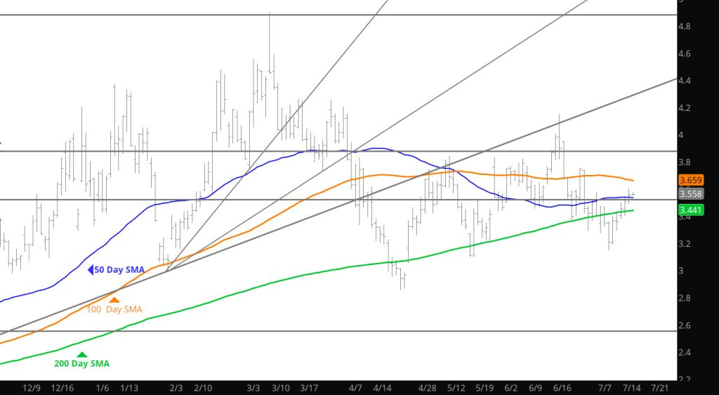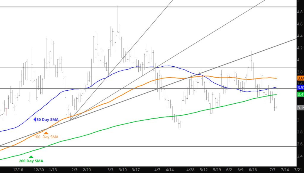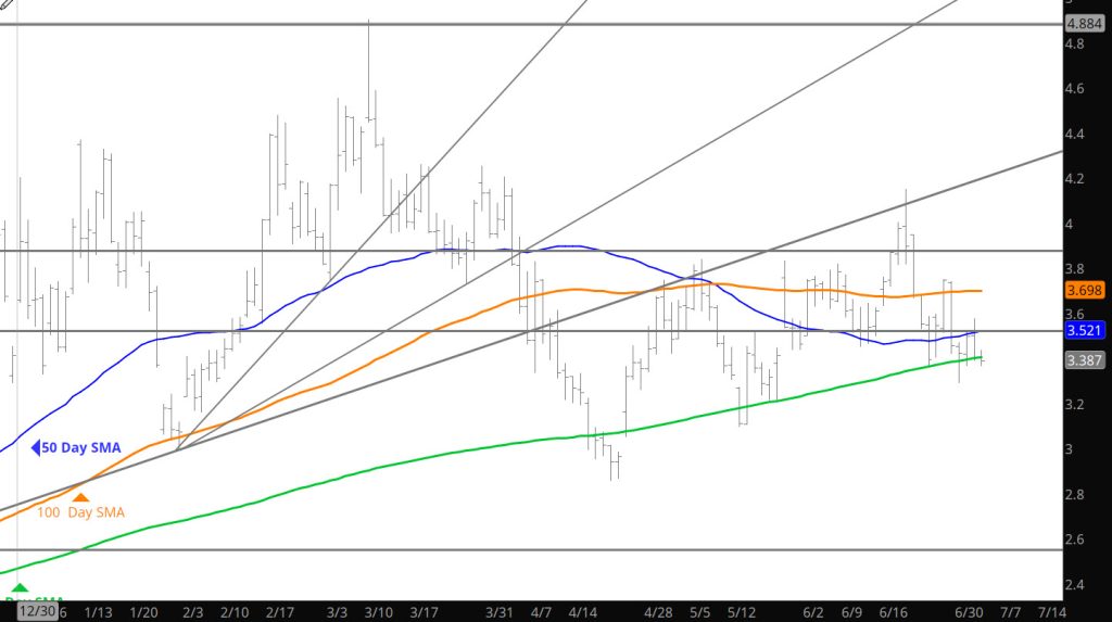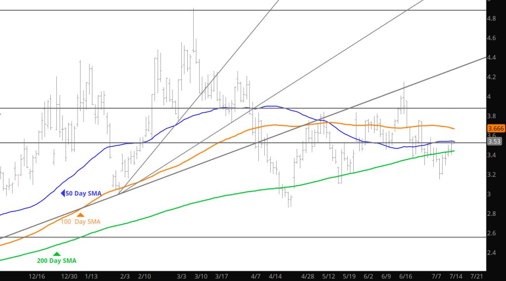 Declines took price to the high side of the support range ($3.25 topside), failed and then rallied slightly. Trade seems light going into the Holiday so look for anomalies that the thin trade may provide. Doubt the trade will provide any kind of major move but the slow declines may provide opportunities for selling some premium.