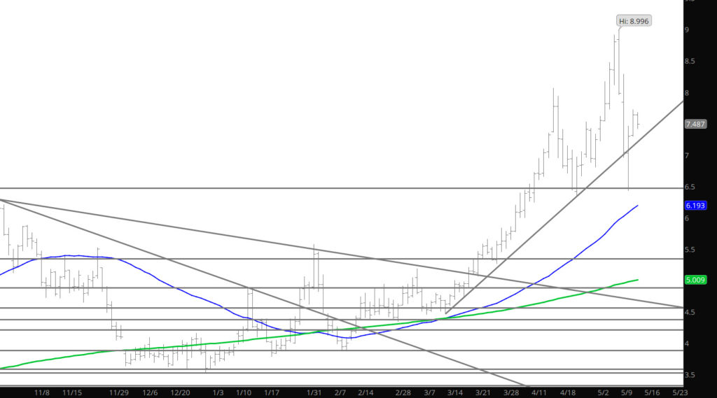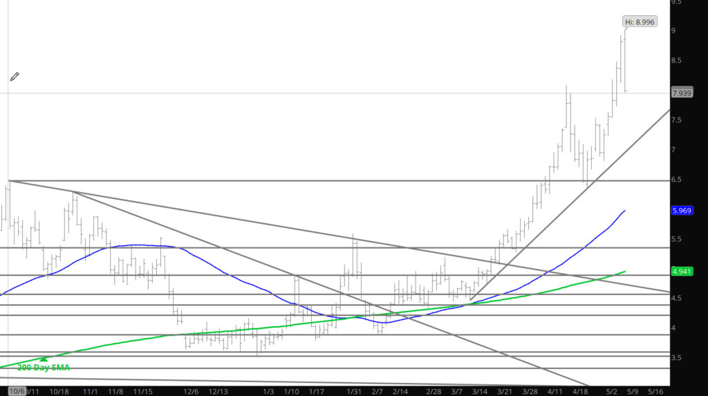 The gas market is extremely overbought by most all of my metrics. The weekly MACD the primary lagging indicator (used sparingly here but monitored on an every week basis for the last thirty years) has exceeded its extreme reading coincident with last year’s high. Simultaneously, the weekly RSI, the primary leading indicator, is yet to confirm the April high (RSI should confirm the weekly high with a higher close).