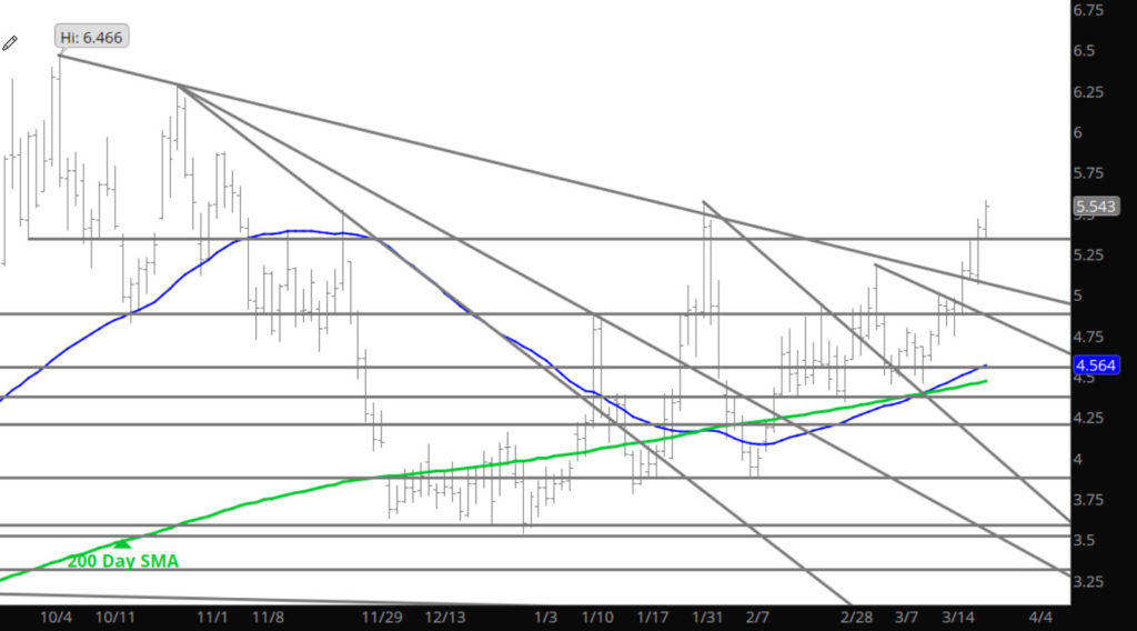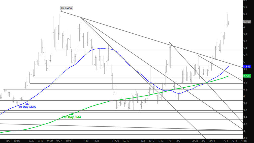 For a Sunday night, price action was subdued. Wrote about the tendencies of intra-month movements recently in the Weekly section and would advise a read. Daily movement may support some additional gains but they are likely to be shallow versus last months gains on various days. This are between $5.70 and $6.00 needs some probing by the bulls, while any decline back below $5.40 will find buyers. April may turn into a range bound month as the market further defines summer injections and the impact from the war.