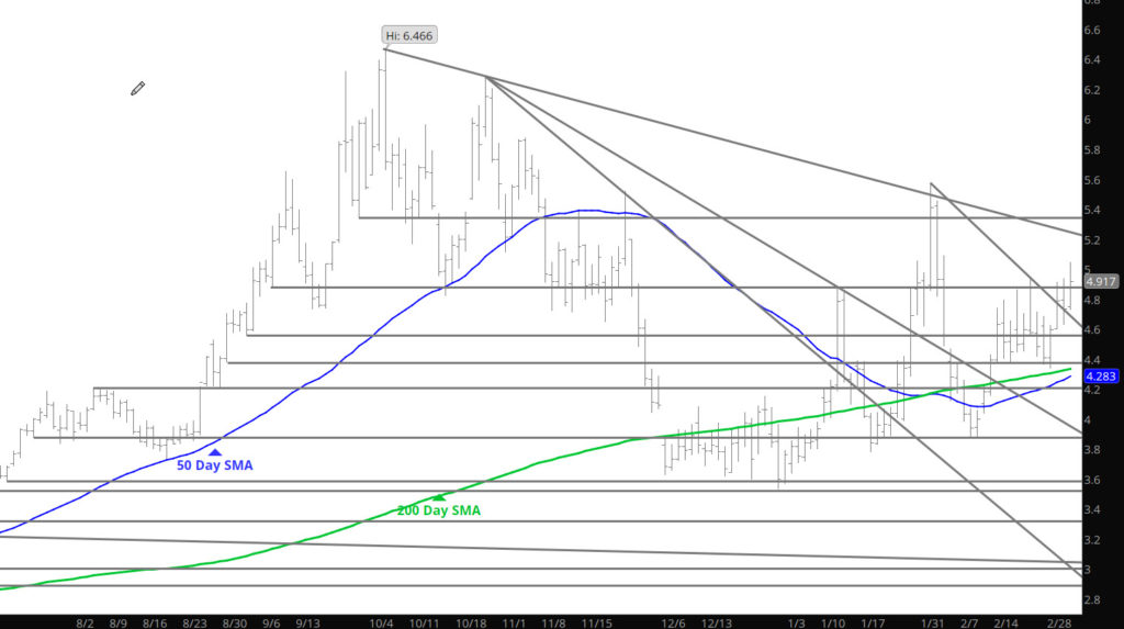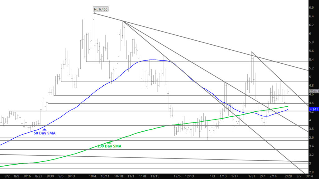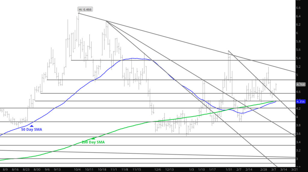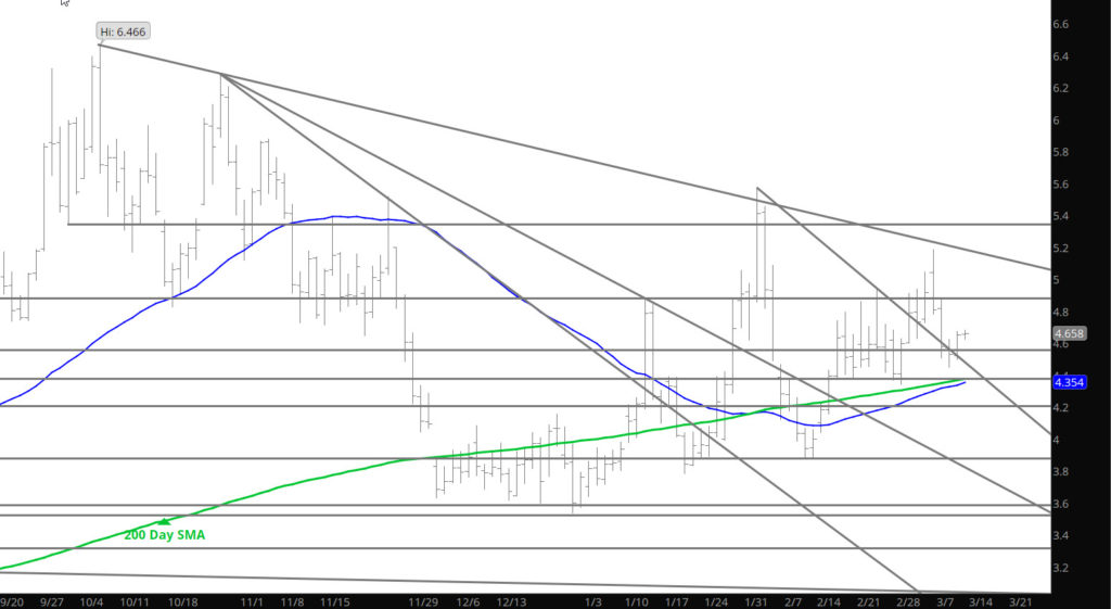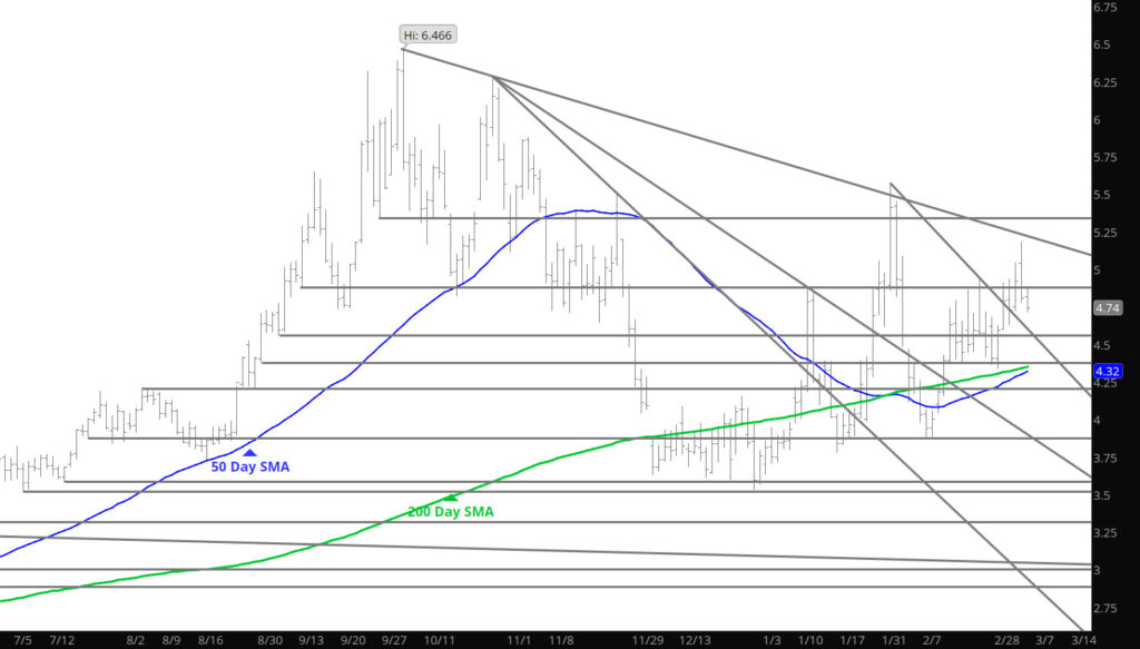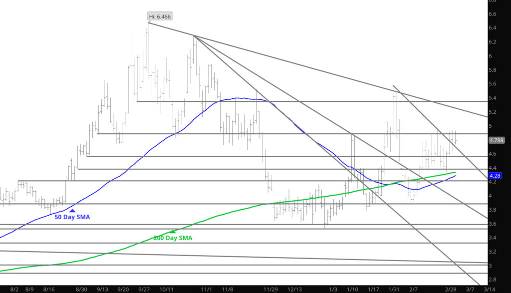 Price action slowed yesterday and while declines extended, the end of the trade day was met with more of a consolidation theme. Continue to expect a decline to test last week’s low at $4.34 (early morning light trade) but I am more interested in the $4.36-$4.40 area as that zone has held support and finding buyers for the last month.