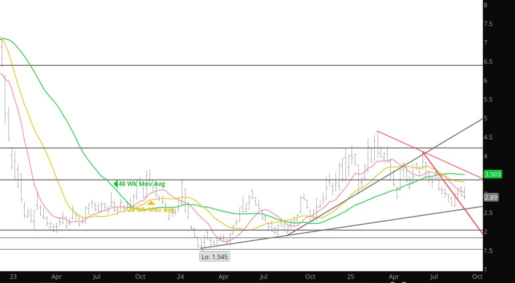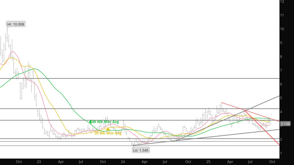The December contract, which continues to enjoy a substantial premium over November (currently $.733, a year ago on the same day December’s premium was $.481), traded down to the upper limit of November’s high volume reversal days on 10/02 and 10/08. $3.55 – $3.59 is well – defined resistance for the November contract and is support for December. Once inside/through that support, expect premium for December to diminish…just as November’s was forfeited. Unless/until December develops the sponsorship to overcome the trend line resistance (declining from its March/June highs) expect it to be guided lower by the trend line and it’s 20 – week SMA The value of that trend line on the December chart is $4.184 and falling about a nickel each week, December’s 20 week SMA is $4.188.