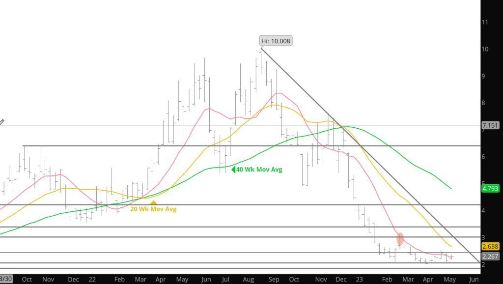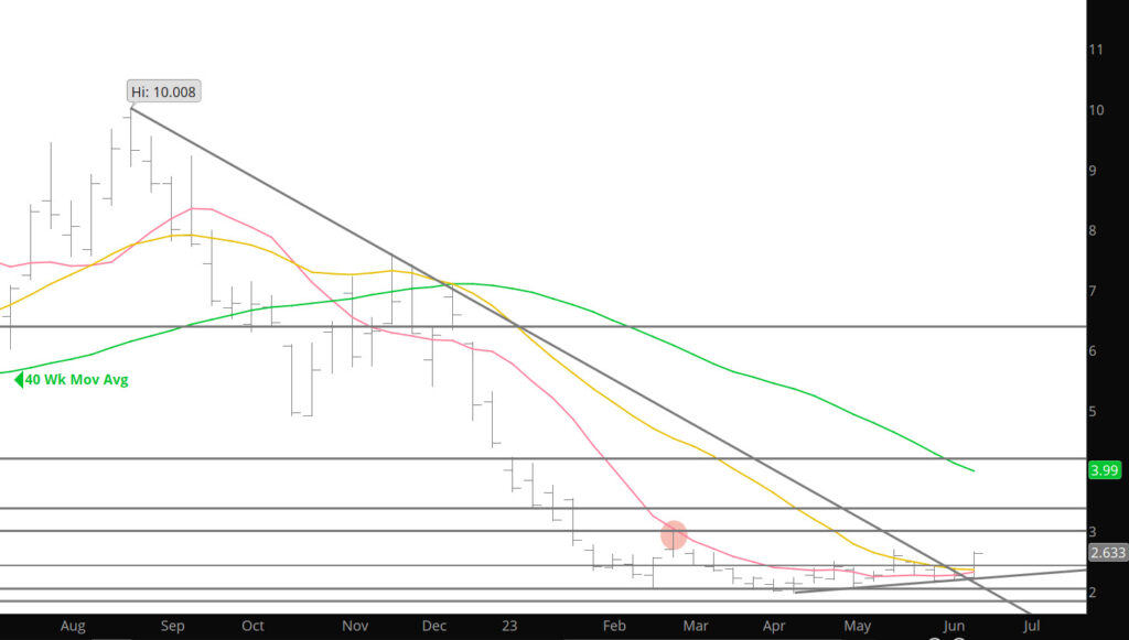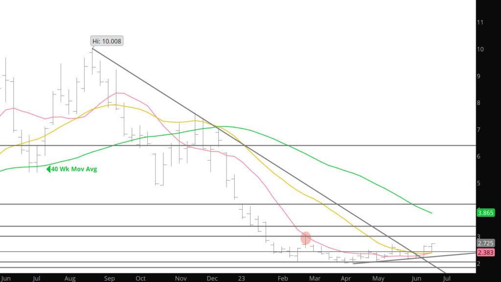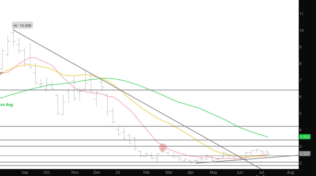 An average decline from the June high suggests a target of $2.40 – $2.50 which also just happens to be the value of a violated declining trend line drawn from the March and highs (currently $2.467 and falling about .03/wk). This was the key break out area discussed a few weeks ago.