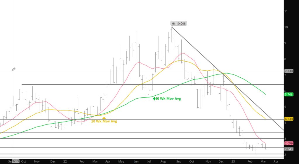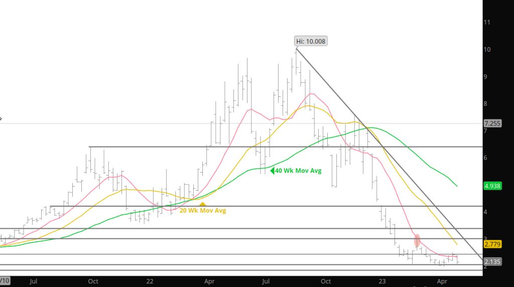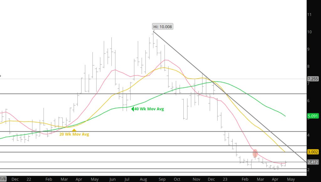 Despite an bearish outside week reversal to the downside, selling sufficient to drive the prompt through the lower extreme of the narrow zone did not materialize. The the failure to extend the decline (the low was $1.946) toward the September ’20 low ($1.795) triggered a short covering rally that left May $.103 higher for the week. That recovery from a test of such obvious and critical, support is a pretty good indication that at least for the near term May may start to look like it is running out of sellers. Technical improvement was also evidenced by the highest volume week since last since last September. Mentioning in previous analysis that weekly volume has been on balance declining since just prior to the February low and suggesting that selling pressure has been starting to dissipate. In addition, total open interest declined 38,702 contracts–the largest one week decline in the total of contracts outstanding since the beginning of the collapse from the August high.