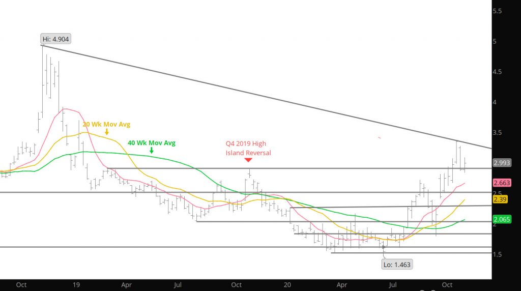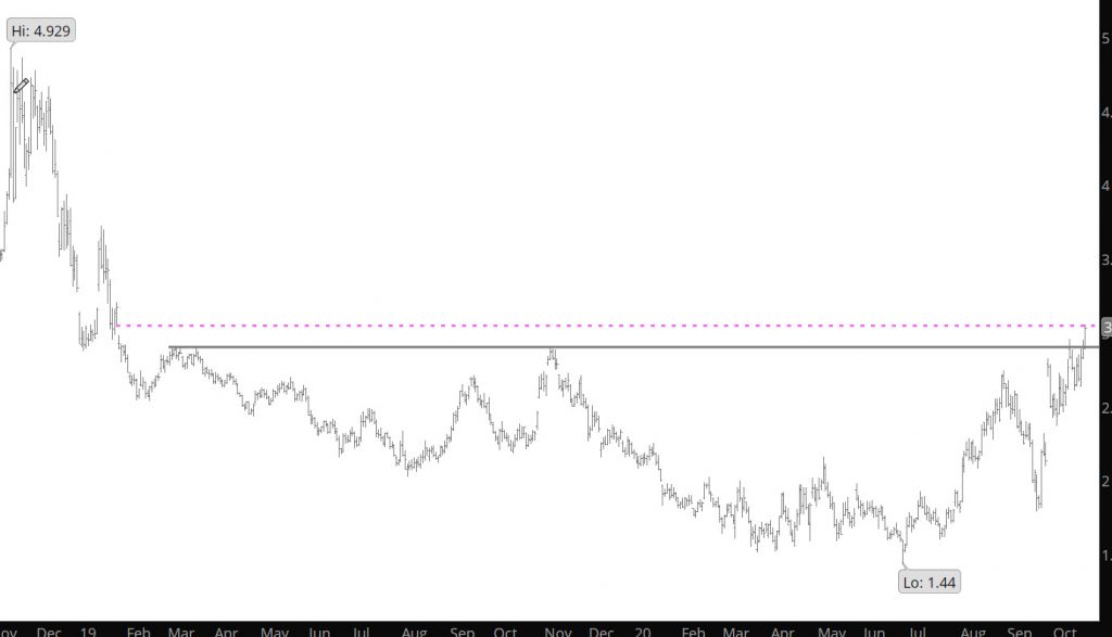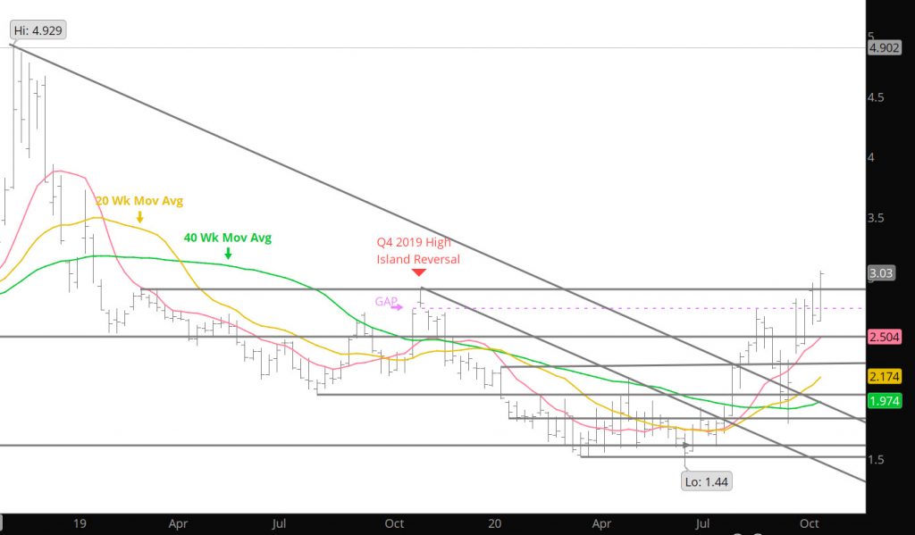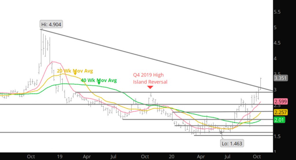 After the declines on the July expiration (low $1.432), the market has started to initiate a bias change, developing a series of higher highs and higher lows. The initial phase of this change occurred when prices were stronger during the annual weak September to trade above the May ’20 high and broke out from a trading range that had confined successive prompts since January ’20. That strength in August failed to break above the previous Nov high. From there the October contract fell nearly $1.00 before recovering to expire at $2.101. That recovery suggested that market had its first significant higher low since Sept ’18, beginning a bias change. That change would be confirmed with a higher high with the large premium afforded the Nov contract. Six consecutive higher weekly closes took prices above the Aug ’20 and the Nov ’19 highs. From there, the Nov contract settled above the Nov ’19 high and conclusively ending the negative bias.