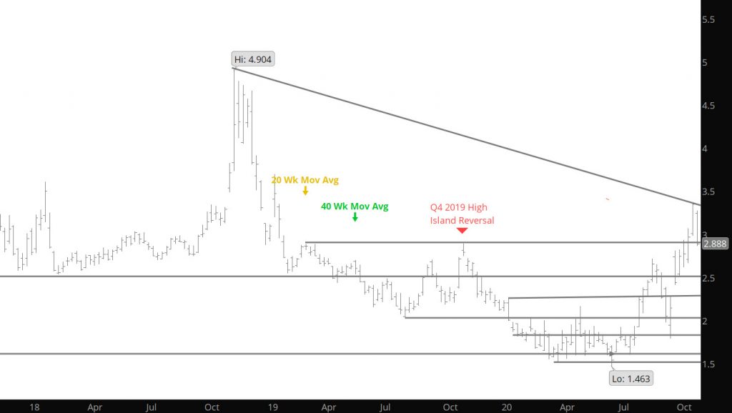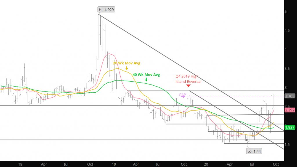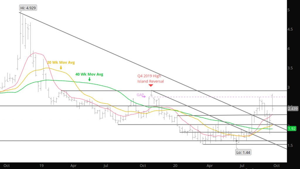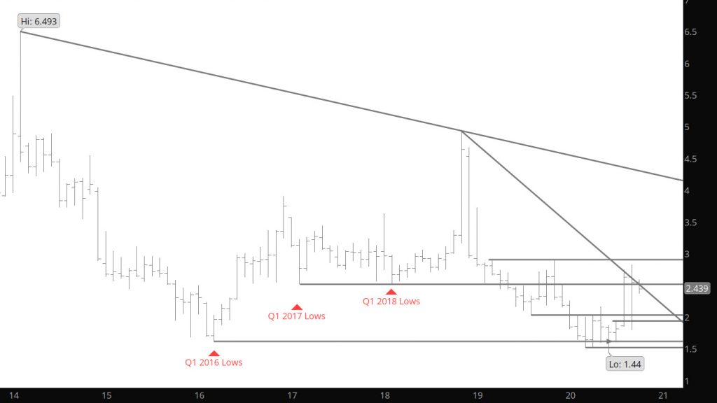 From those declines (for nearly two years) each rally was a lower high and ware met with a lower low. The exception was the brief rally in the fall of 2019 which had a lower high followed with a higher low. When the trend redeveloped immediately that exception should be considered a counter trend rally.