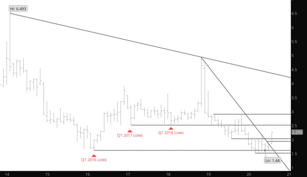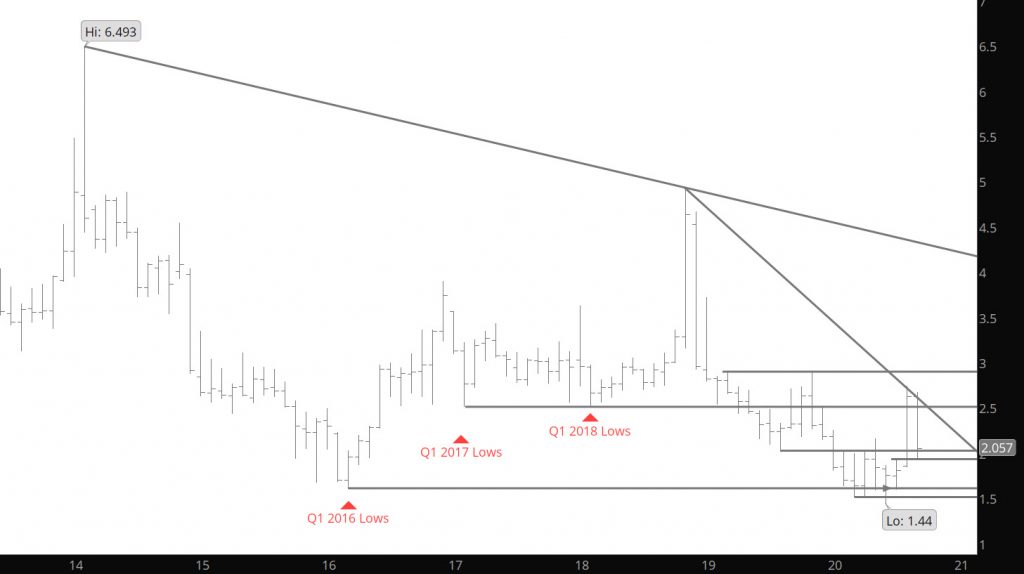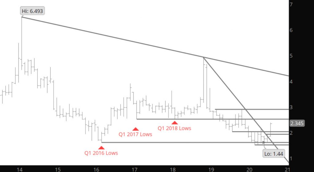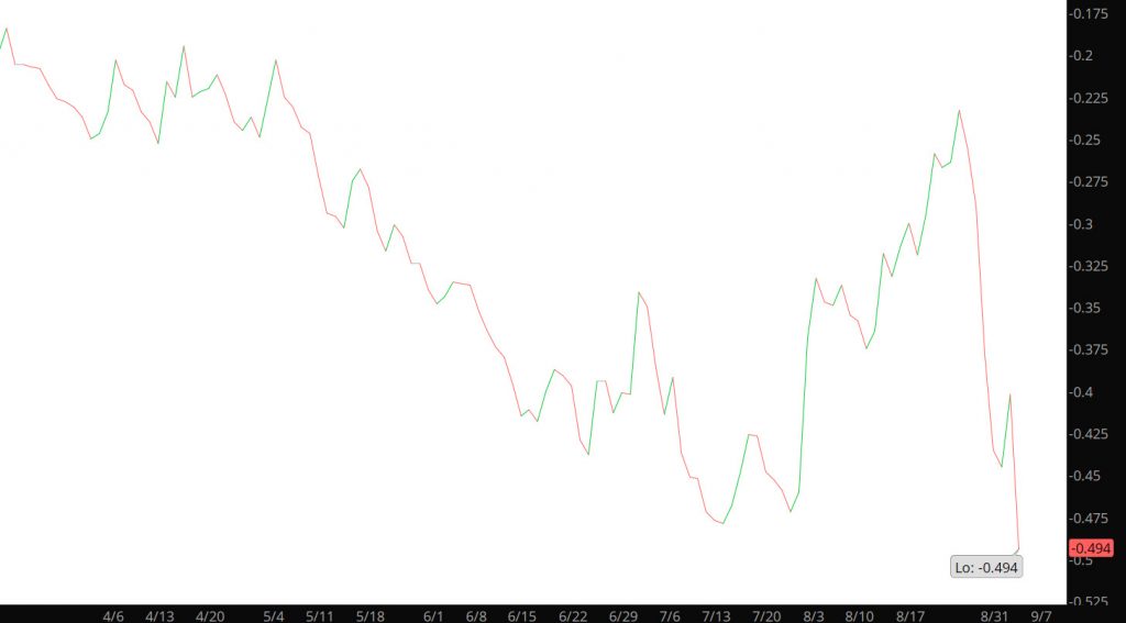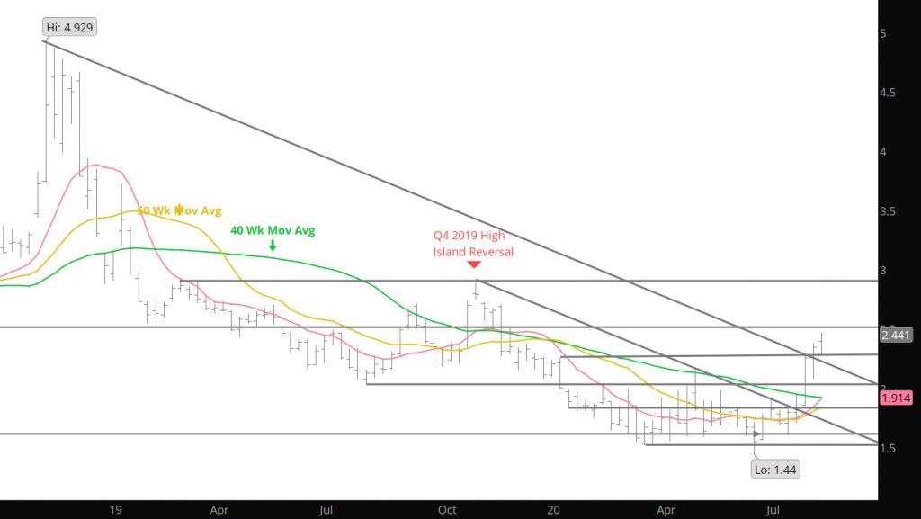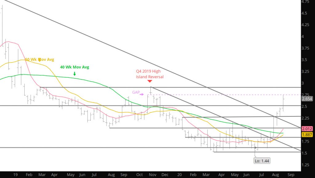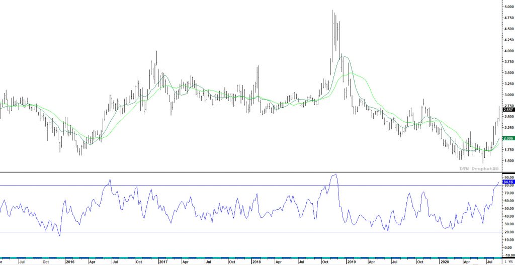 Notice that the solid gains during the August month in 2002 (blue circle), prices then retracted 14.6%, before extending on a long term rally that didn’t conclude until February ’03. While that started, the spread between Oct and Nov contracts expanded to $.40 (premium Nov) during early Sept. Similar to the current year, prices held firm all during the August trade and currently trade $.45 differential to the November contract. The recent declines from the highs at $2.743 have corrected 14.7% at the lows yesterday. In 2002, the market did not correct until Feb 2003 as prices skyrocketed. Not sure if this occurs in 2020 but wanted to bring history to your attention.