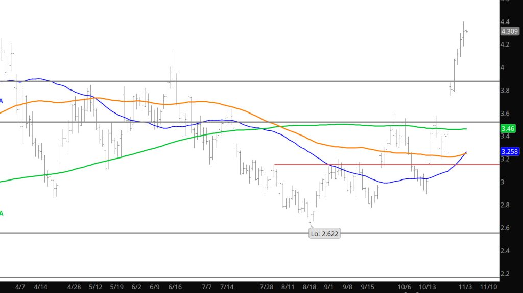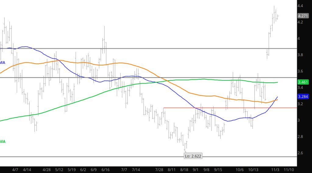 Price action is holding firm with some tight daily ranges which signals a lack of commitment from the masses. Today may provide additional information on the the near term bias. While the break above $4.00 provided some income in the last week, the storage report will determine the future action in the next week.