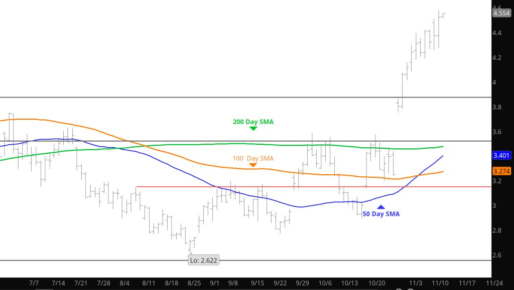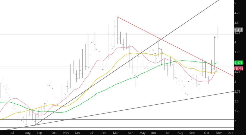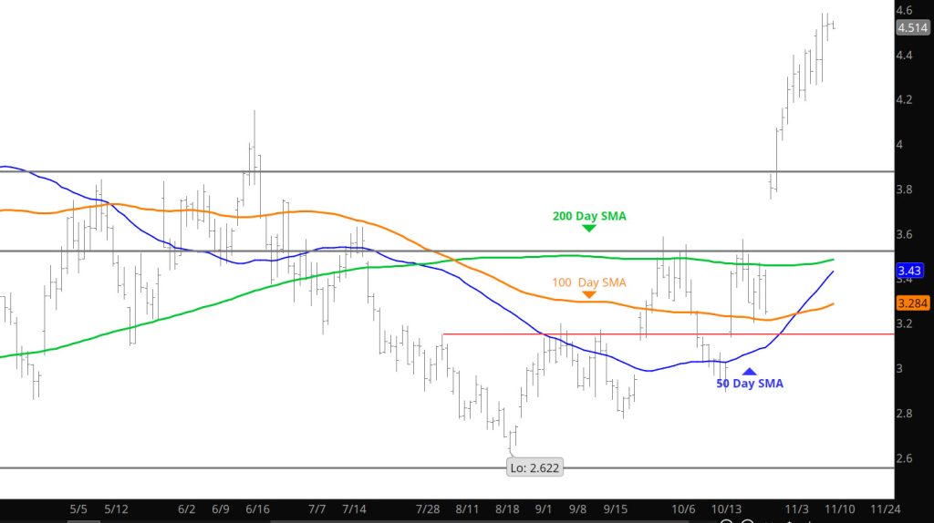 Prices seem to want to test the high side of the Nov contract range that has been developing. Positions should hold until existing weather moves on and the storage report is released– watch for a retracement back to the early month lows ($4.20-$4.00).
