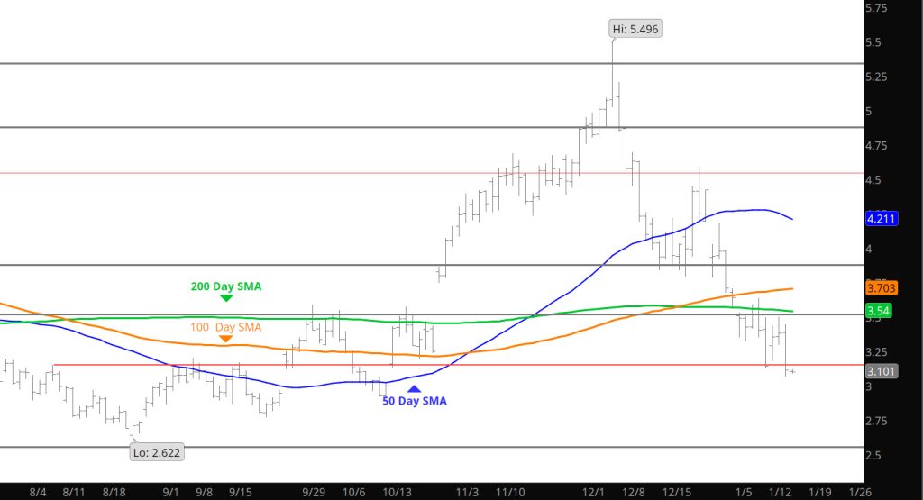 Go into the many aspects of why the market flipped to a negative bias in the Weekly section — but all you need to see is that prices are down $.15 and challenging support zones in the early Sunday trade. Not sure how this will track (1: an immediate decline during Jan or 2: or a series of lower highs and lower lows) but the market is clearly setting up for the Q1 lows to be established. My guess is the latter with the low occurring next month.
