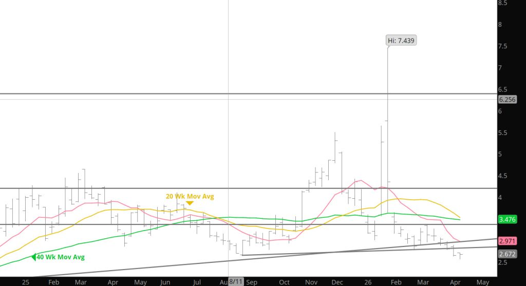The lowest weekly close during 2025 was 2.692, this week’s close at $2.648 decisively violates the weekly closing support, but lower volume during than the third week of August (2,082,932 v 2,345,182) indicates fewer willing sellers than there were at the Q3 low. Even so, the highest weekly volume total in four weeks (since 2,509,774 contracts traded during week ending 03/20/26) suggests that the initial test of the ’25 low is likely that May will be offered lower during the coming week. This week’s close was the lowest since prompt December ’24 closed at $2.525 on 10/25/24 and volume was also higher as that low was traded.