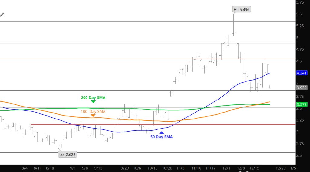 Last week’s declines was expected, now we have a market that will be subject to thin volume and volatile swings during and around the next week. Would suggest sticking to the range from early Dec (as the market started to correct) and last week for the range to expiration ($4.40-$3.90).